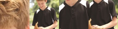 - Three matching buttons on a boxstitched placket