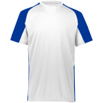 4.8 ounce 50% polyester/50% cotton jersey knit * Contrast color V-neck collar * Set-in sleeves with contrast color sleeve stripes