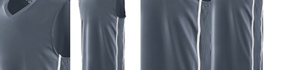 100% polyester wicking knit * 92% polyester/8% spandex pinhole mesh side inserts * Wicks moisture away from the body * Ladies' fit * Heat sealed label * Self-fabric mitered V-neck collar * Contrast color stripes on sides * Racerback styling * Double-needle hemmed armholes and bottom