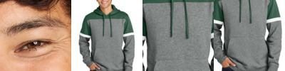 Drive home who you're cheering for in this cotton-rich colorblock hoodie. 7.5-ounce, 60/40 cotton/poly Vintage Heather fleece body Team color on hood, upper chest and shoulders Jersey-lined hood Dyed-to-match flat knit drawcords Twill back neck tape Self-fabric sleeve sport stripe Front pocket 1x1 rib knit sleeve cuffs and hem Tear-away label