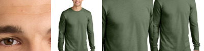 4.6-ounce, 60/40 ring spun cotton/polyester CVC blend Subtle heather texture on all colors except Pitch Black and White Recycled, high-performing black tear-away label Softstyle's high stitch density fabric offers a smoother printing surface Narrow width, rib collar Taped neck and shoulders Modern classic fit, seamless body Double-needle hem Rib cuffs